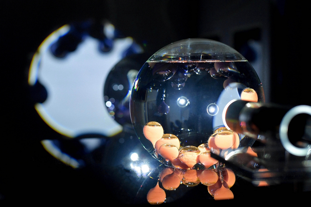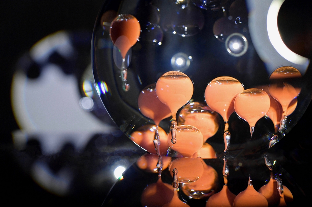 VOLVOX est le fruit d’une collaboration arts et sciences menée pendant quatre ans entre des équipes, d’une part, du laboratoire LuMIn et de l’Institut de Chimie Physique à l’Université Paris-Saclay et, d’autre part, du laboratoire LadHyX à l’école Polytechnique.